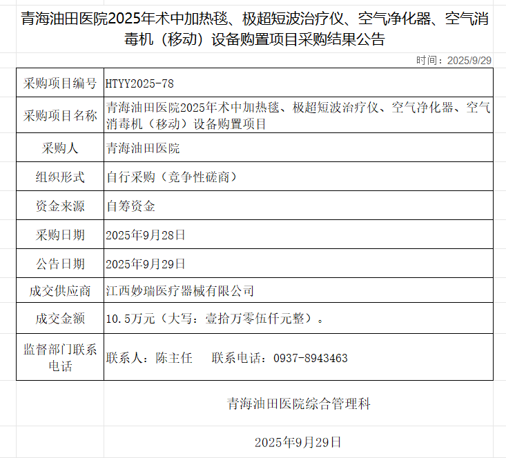 青海油田医院2025年术中加热毯、极超短波治疗仪、空气净化器、空气消毒机(移动)设备购置项目采购结果公告